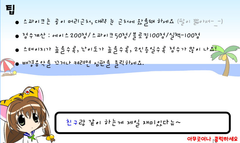 게임에서 사소한 팁들이 나와있으며 상대선수들을 상대하여 이기면 다음 스테이지로 갈 수 있습니다 서브나 스파이크가 생각보다 힘들기 때문에 많은 연습이 필요한 게임인거 같습니다 이 게임은 또한 혼자플레이가 가능하고 2인에서 플레이가 가능합니다