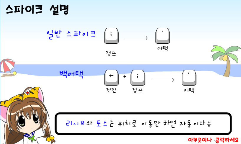 게임방법이 나와있습니다 스파이크하는 방법과 서브하는 방법들이 나와있으니 해당 기술들을 잘 숙지하여 게임을 원활하게 플레이하시길 바랍니다