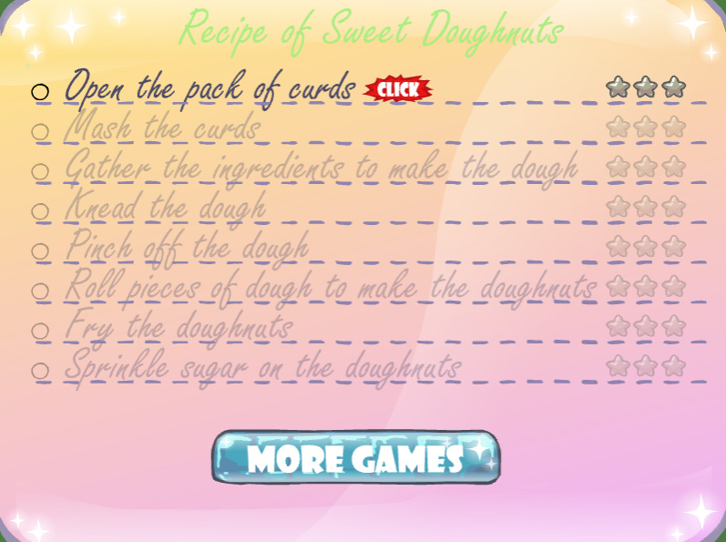 게임방법 : 도너츠를 각각의 재료들을 이용하여 단계별로 재료들을 손질하고 평가를 받고 최동적으로 달콤한 도너츠를 만들면 됩니다