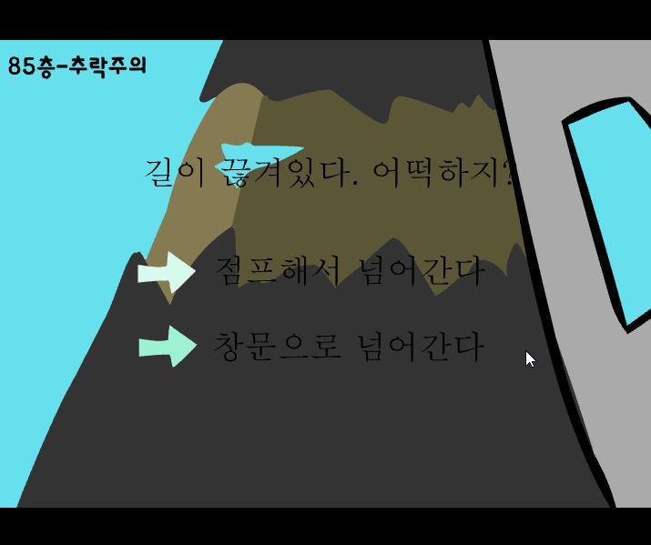 - 85층 추락주의입니다 길이 끊겨 있습니다 어떡하지 창문으로 넘어간다를 선택합니다