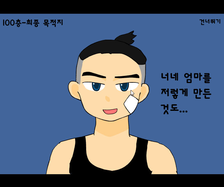 100층 단계입니다 수상한 남자는 새아빠라고 하네요 이제 새아빠와 대결을 통해서 승리하면 됩니다 중간에 나오는 시간초 에는 점프한다를 선택합니다 그 후 새아빠를 물리치면 게임의 엔딩을 볼 수 있습니다 주인공의 마지막 선택을 확인할 수 있습니다