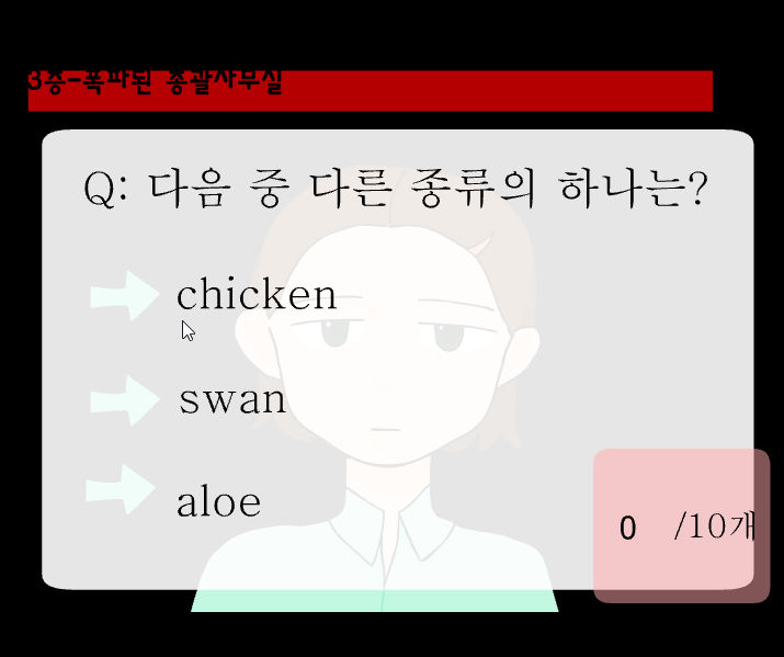 23층에 대해서 알아보겠습니다 어떤 남자가 공격을 합니다 (회피하기 파란색 선택) 하시면 다음 장면으로 넘어가게 됩니다 지혜의 문이 보이는군요 지혜의문에서는 10가지 문제를 맞히시면 됩니다 (재도전이 가능하기 때문에 여러 번 플레이하여 정답을 외워주세요)