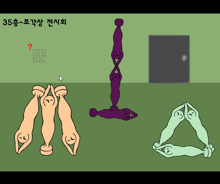 35층입니다 조각상 전시회군요 "의지의 빨강 근검의 노랑 순수의 하양 셋이 힘을 모아야 한다"라는 말과 함께 정답을 맞혀야 하는데 살색깔 동상을 선택해 주세요