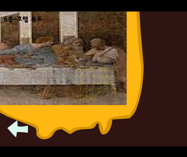 6층 호텔 복도입니다 "바다의 우유가 썩기 시작하는 달에 동아줄은 당기면 길이 열리리라" 5번 방에 들어가시면 됩니다 여기서 말하는 바다의 우유는 굴이며 굴이 썩을 수 있는 계절은 5월입니다 그 후 침대방에서 커튼줄을 잡아당기시면 됩니다