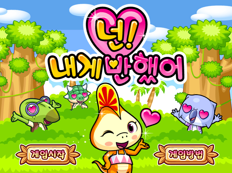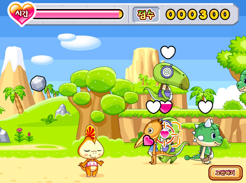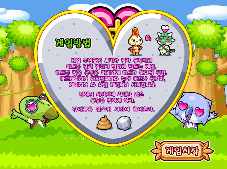 게임 방법 : 게임의 주인공인 로미가 남자 공룡에게 하트를 날려서 맞춰서 반하게 만드는 게임입니다 하트를 맞은 공룡은 머리 위에 하트가 하나씩 생깁니다 하트 게이지가 채워질 때마다 눈에 하트가 생기며 게이지가 다 차면 캐릭터가 사라집니다 정해진 시간 안에 최대한 많은 공룡을 반하게 만들자 장애물을 맞으면 시간이 줄어들게 됩니다