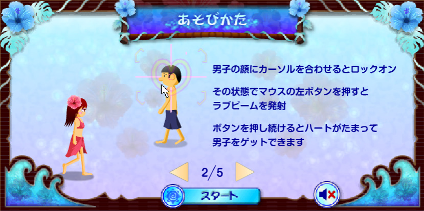 게임방법 : 눈빛보내기 3번째 시리즈가 나왔습니다 해변에 있는 남자들을 눈빛을 보내서 매혹되게 만들고 하트를 얻어 제한시간안에 많은 점수를 얻으면 됩니다