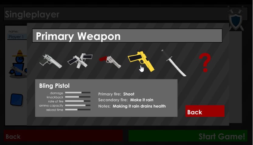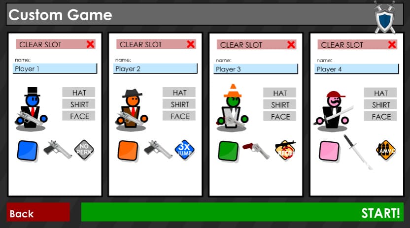 여기 보시면 4명의 캐릭터를 커스텀할 수 있고 플레이어의 이름을 정할 수 있습니다 다양한 무기들이 존재하는데 무기들의 특성이 다르기 때문에 모든 무기들을 써보고 자신이 하고 싶은 무기를 선택하시면 됩니다 기본적으로 제공하는 무기는 총 5개가 존재합니다 (권총 쌍권총 리볼버 검자루) 검자루는 다른 무기의 비해서 대미지가 엄청 쌔기 때문에 근접전에서 상당히 좋은 무기입니다