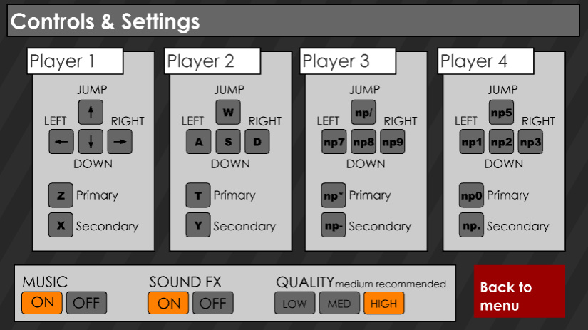 조작키는 앞서 말했듯이 건메이헴은 4인용까지 지원하기 때문에 조작키도 4p까지 나와있습니다 np는 오른쪽 키보드에 있는 숫자패드를 의미합니다 조작키 메뉴에서는 음악 사운드 게임의 퀄리티 등을 조절할 수 있습니다