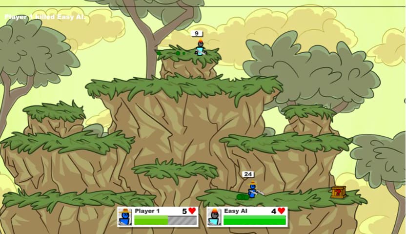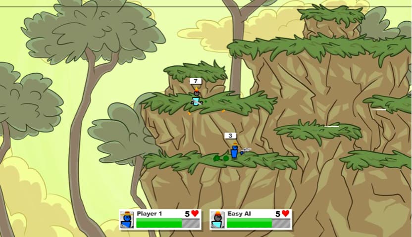 게임에 들어가게 되면 자신의 캐릭터와 상대편의 캐릭터가 제일 하단에 게이지와 하트가 표시가 됩니다 적을 향해 총을 쏘게 되면 상대 캐릭터의 게이지가 깎이게 되고 적의 공격을 맞게 되면 자신의 게이지가 감소하게 됩니다 또한 하트의 개수가 0이 될 경우 게임에서 지게 됩니다 게임을 하다 보면 상자가 같은 게 나오는데 이 상자를 부수면 상자 안에 다양한 무기를 사용할 수 있습니다