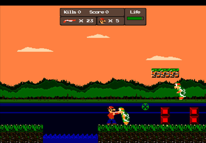 게임 방법 : 해당 게임은 마리오와 덕 헌트의 패러디물로 해당 게임을 합쳐놓은 듯한 게임입니다 마리오를 제어하여 장애물들을 피해 안전한 곳으로 달려가는 것이 목표입니다 이 게임에는 많은 레벨이 있으며 각 레벨을 클리어하는 것이 목표입니다