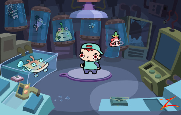 어항에 있던 분홍색 케이스 같은걸 꺼내서 오른쪽 초록색 컴퓨터에 끼웁니다