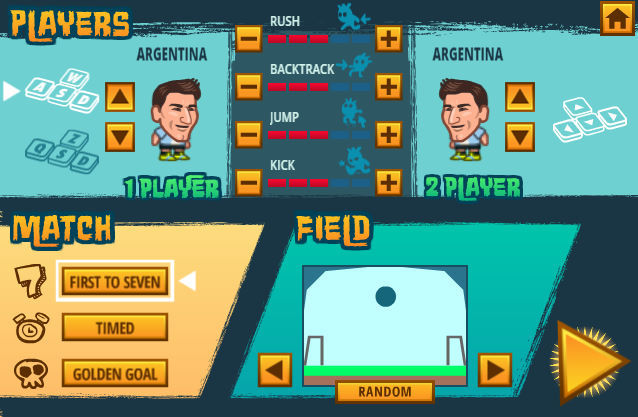 2인용 플레이를 하기전에 선수들의 능력치와 선수들을 선택할 수 있습니다 그리고 맵(필드)과 게임의 모드도 선택이 가능합니다 모드는 먼저 7점을 따는 모드와 시간 안에 많은 골을 넣는 모드 첫 골을 넣는 쪽이 이기는 모드가 있습니다
