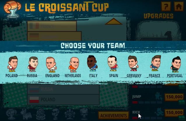 올림픽처럼 나라를 대표해서 우승을 하는 게임입니다 여기서는 다양한 컵 들이 존재하여 컵에서 우승자가 되어 다양한 컵들을 도전해보세요 6가지의 컵들이 존재합니다 대두 축구에 나오는 국가들은 (폴란드, 러시아, 잉글랜드. 네덜란드, 이탈리아, 스페인, 독일, 프랑스, 포루트갈 등) 이 있습니다