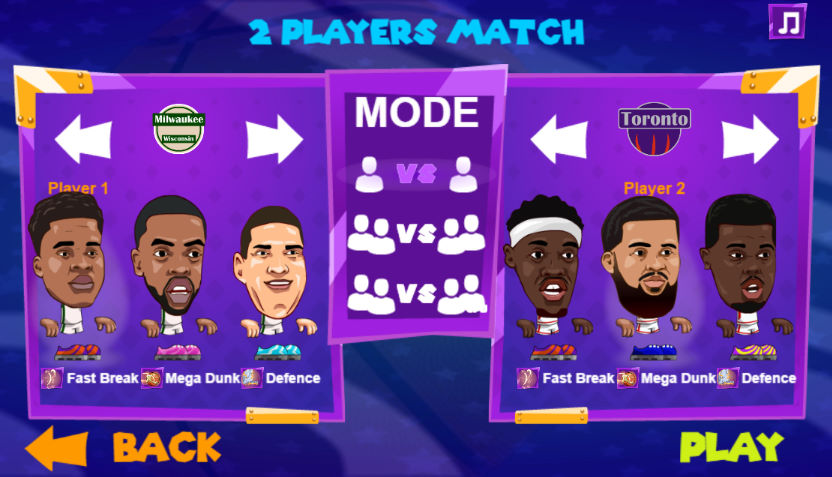 각 팀마다 선수들 끼리 사용할 수 있는 스킬들이 다르기 때문에 캐릭터 별로 하나씩 플레이해보고 자신과 맞는 캐릭터를 고르는 것이 중요합니다 또한 모드에서도 1대 1로 대결을 할 수 있는 모드도 있고 2대 2로 대결을 할 수 있는 모드도 있습니다 난이도는 총 2개로 Normal과 Hard로 구별됩니다