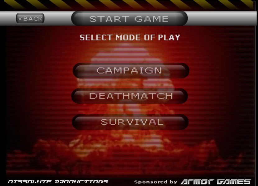 게임을 시작하게 되면 모드를 고르는 창이 뜹니다 위에서 부터 차례대로 캠페인, 데스매치, 서바이벌 모드가 존재합니다 캠페인 모드는 무기와 캐릭터를 해금할 수 있는 모드입니다 캠페인 모드에는 3개의 난이도가 있는데 쉬움 보통 어려움 세 개의 난이도가 존재합니다 어려움 난이도는 진짜 어렵다고 하니 주의하면서 플레이하는 게 중요합니다