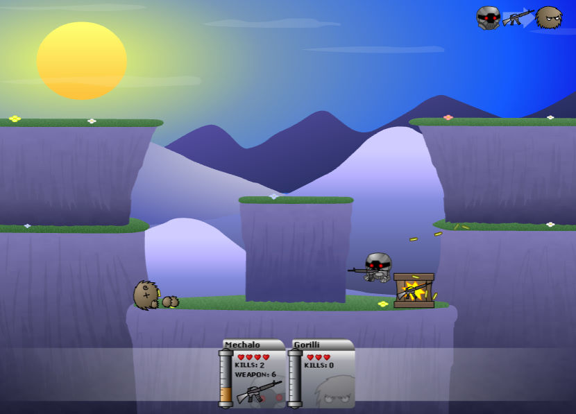 화면 아래쪽에는 자신의 라이프와 킬을 한 횟수가 뜹니다 그리고 게임을 플레이 하다 보면 아이템 상자가 가끔씩 등장하는데 이 아이템 상자에는 게임을 플레이할 때 도움을 주는 아이템들이 등장하게 됩니다 (HP 회복, 무기 등) 또한 게이지가 자신의 HP를 뜻하기 때문에 게이지가 다 줄어들지 않게 공격과 방어를 번갈아 가면서 하시면 됩니다