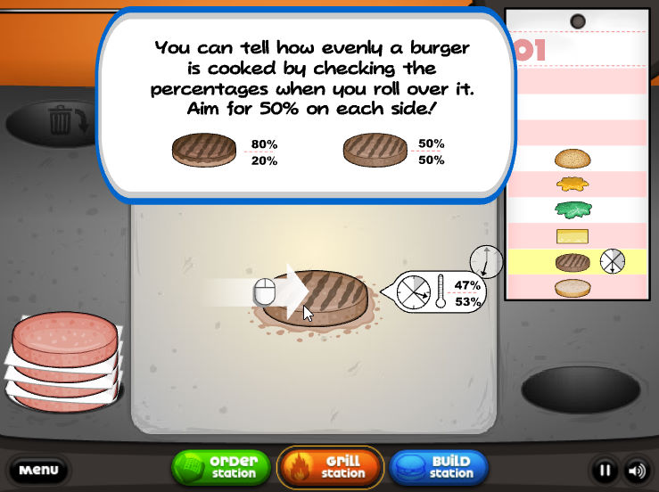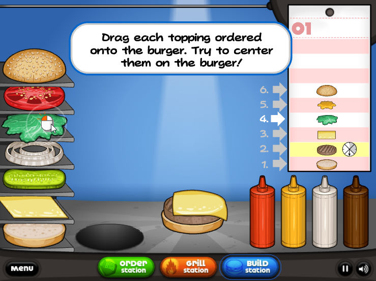 열정적으로 햄버거를 뒤집으시면 됩니다 Papa's Burgeria는 햄버거를 뒤집고 돈을 버는 기본 사항을 안내해줍니다 첫 주문을 받고 화면의 어떻게 햄버거를 만들지 표시가 됩니다 주문을 받고 패티를 튀기는 것으로 시작하여 토마토 양파 소스 시드 및 기타를 합쳐 소중한 버거 재료로 버거를 완성하시면 됩니다