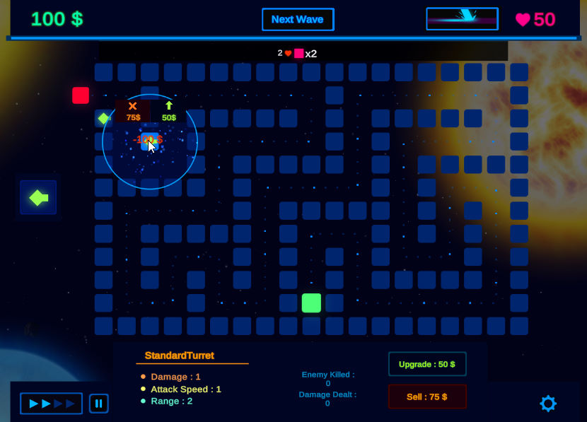 우주에서 펼쳐지는 디펜스 게임입니다 왼쪽에서 몰려오는 웨이브들을 타워를 설치하여 막으시면 됩니다 적들을 죽이면 돈을 얻을 수 있으며 돈으로 타워를 업그레이드 하거나 타워를 더 추가할 수 있습니다 특정레벨을 넘어가면 다양한 타워들도 해금되니 재미있게 즐겨주세요
