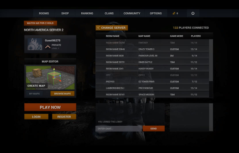 다양한 서버중 하나에 들어가서 방에 입장하여 세계 여러사람들과 총으로 대전을 하시면 됩니다 서버는 미국서버와 유럽서버 아시아 서버가 있습니다