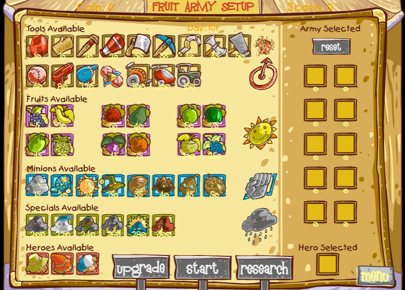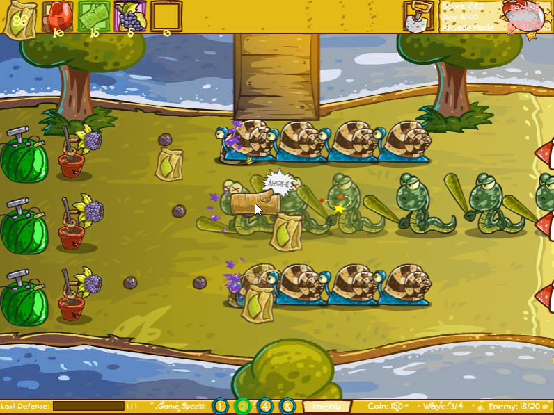 과일 디펜스 게임입니다 오른쪽에서 몰려오는 달팽이들과 몬스터를 다양한 아이템을 이용해서 막으면 됩니다