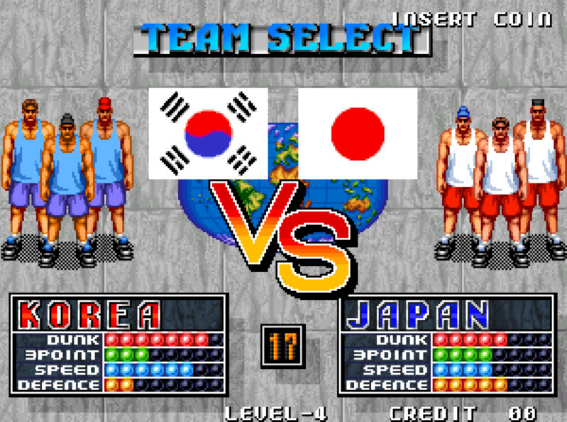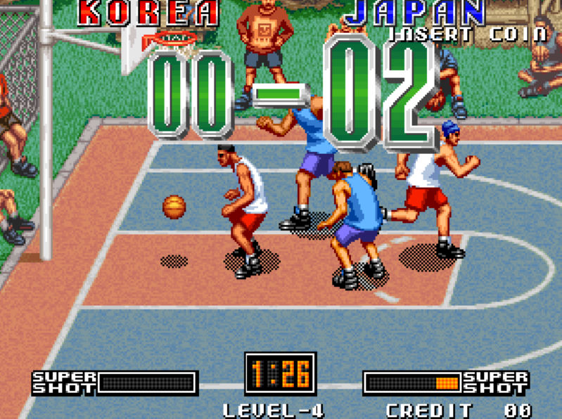 오락실 농구게임으로 유명한 덩크 드림입니다 유럽 수출판에서는 스트리트 후프라는 이름을 쓰고 있습니다 국내에서도 수출판 이름을 사용하여 스트리트 후프가 국내에서 더 잘 알려져 있습니다 게임은 3대 3으로 시작하여 11점을 먼저 따 내는 팀이 승리하는 방식의 게임입니다