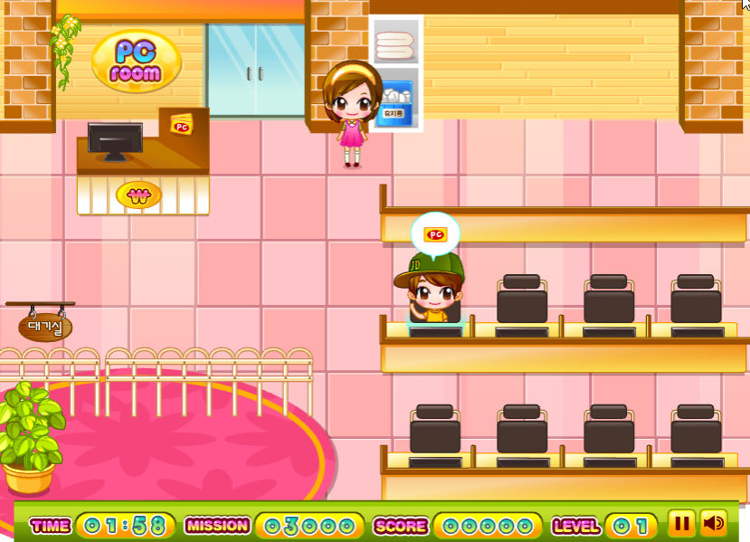 피씨방에 손님이 오면 필요로하는 물건을 가져다주며 피씨방을 운영하는 게임입니다 단 너무 늦게 갖다주면 손님이 화가나서 나가버리니까 주의 하세요