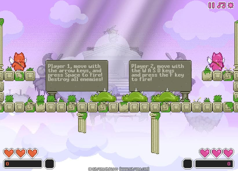 트윈샷은 2009년도에 출시된 협동 슈팅 게임입니다 플레이어들은 활과 화살을 사용하여 침략자들로부터 자신의 고향을 지키는 것이 목표입니다 플레이어가 맵 안에 있는 모든 적들을 파괴하면 해당 레벨을 클리어할 수 있습니다 총 50개의 레벨로 구성되어 있으니 재미있게 플레이해보세요