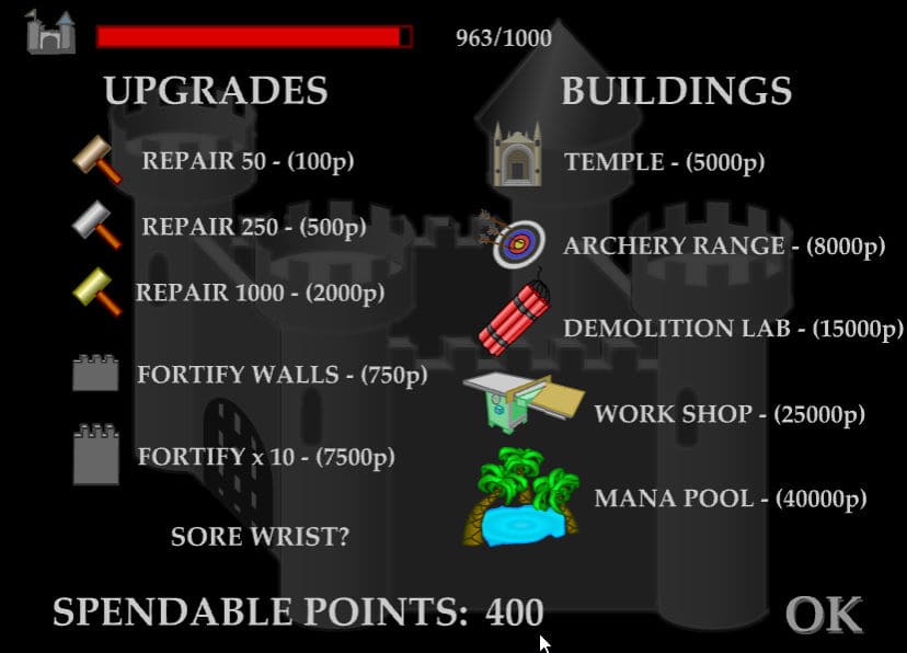 왼쪽에서 몰려오는 적들을 공중으로 날려 제압하는 디펜스 게임입니다 각 웨이브마다 몰려오는 적들을 전부 죽이면 다음 웨이브로 넘어갈 수 있고 넘어가기 전에 나오는 아이템 창에 있는 다양한 아이템들을 업그레이드하여 성을 좀 더 강하게 만들 수 있습니다