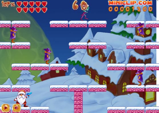 맵 안에 산타가 등장하여 맵에 있는 모든 적들을 제거하는 플래시게임입니다 게임의 방식은 보글보글 게임과 거의 유사하며 물총을 통해서 적들을 3번 공격하면 제거할 수 있는데요 3번 공격했을 시 적은 얼음이 되고 다시 적에게 부딪힐 경우 얼음이 된 적은 굴러서 다른 적들까지 모두 공격하게 됩니다 이렇게 맵 안에 있는 모든 적들을 제거하시면 다음 레벨로 넘어갈 수 있습니다