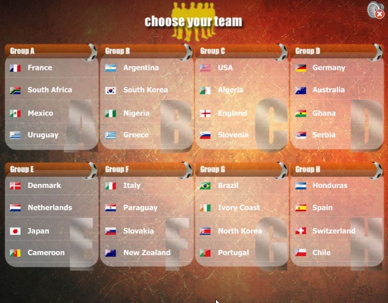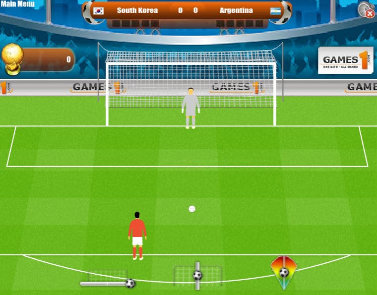 월드컵 2010 게임입니다 해당 게임은 승부차기를 중심으로 상대와 공격과 방어를 나눠서 골을 넣거나 골을 막는 것이 목표입니다 골을 넣을 때는 골을 넣을 위치와 높이, 파워를 마우스로 정해서 골을 넣으시면 되고 골을 막을 때는 상대가 공을 찰 때 표시되는 x표시를 잘 보고 x표시에 마우스를 가져다 놓으면 해당 골을 막을 수 있습니다 각각 5번씩 공을 차게 되는데 공을 많이 넣는 플레이어가 승리하게 됩니다 여러 나라와 대전을 벌여 월드컵에서 우승을 차지하시면 됩니다