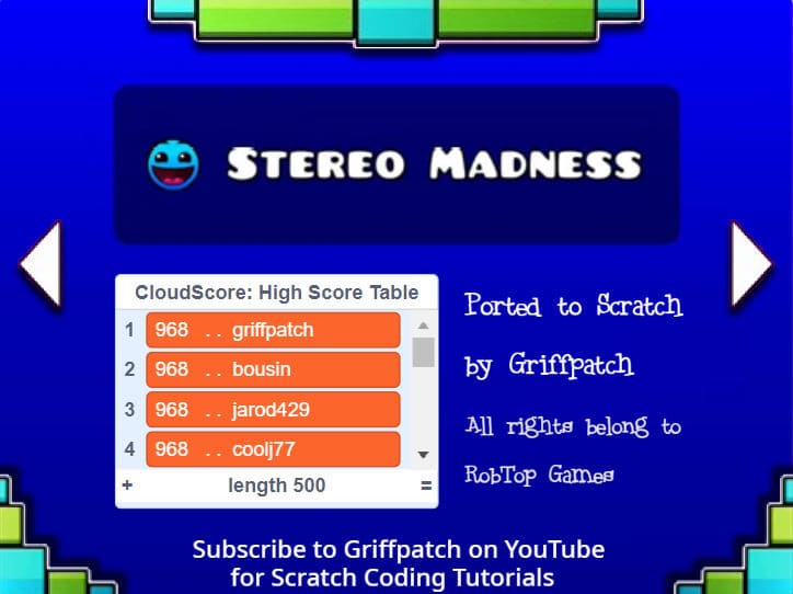이 게임은 Scratch에서 Griffpatch님이 만든 지오메트리대쉬 게임이며 실제 원본 게임과 매우 유사하기 때문에 Scratch 유저들에게 극찬을 받은 게임 중 하나입니다 Girffpatch님 말씀에 따르면 RobTop Games의 소유자에게 저작권이 있고 웹사이트를 방문해서 게임을 다운로드하시면 더욱 재미있게 지오메트리대쉬를 할 수 있다고 합니다