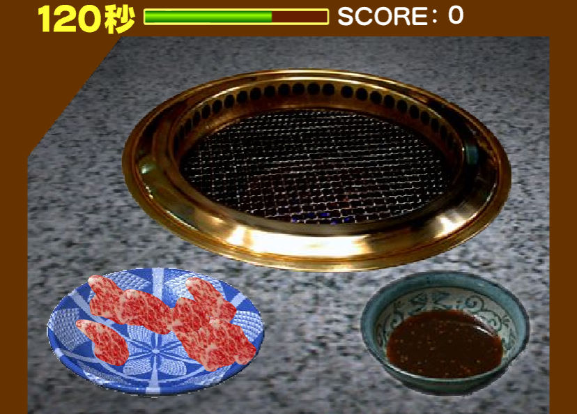 제한시간 안에 많은 고기를 굽으면 되는 고기굽기 게임입니다 왼쪽에 고기가 있고 중간에 불판이 있습니다 왼쪽에 있는 고기를 옮겨서 불판에 가져다 놓으면 고기가 자동적으로 익게 되는데 익은 고기를 오른쪽에 위치한 양념장에 놓게 되면 잘 익었으면 20점을 얻게 되고 잘 안 익었으면 위쪽에 있는 초록색 게이지가 조금씩 닳게 됩니다