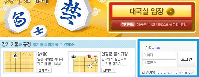 아이디가 없으신 신규 유저라면 "회원가입" 후 넷마블 장기에 로그인을 해주시면 됩니다 그 후 위쪽을 보시면 대국실 입장 버튼이 존재합니다 "대국실 입장"을 클릭해 주신 후 게임 설치를 진행해 주세요 게임