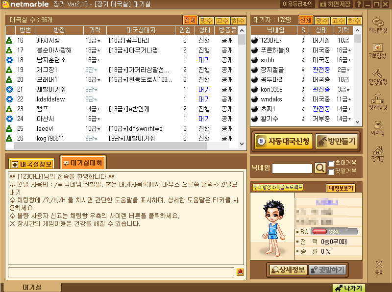 또한 본격적으로 게임을 하고 싶다면 대기자 목록을 보시고 해당 목록 중에서 마음에 드는 상대가 있다면 상대에게 대국 신청을 해주신 후 게임을 진행하는 방법이 있고 자동대국신청 또는 방 만들기를 통해 대국을 직접 하는 방법도 있습니다