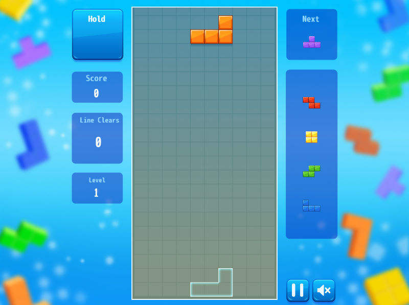 게임이 시작되었습니다 인터페이스에 대해서 알아보겠습니다 인터페이스는 왼쪽부터 설명드리자면 홀드와 스코어 그리고 라인 클리어 레벨이 있습니다 여기서 말하는 홀드는 놓을 공간이 없는 블록을 임의로 저장할 수 있는 공간입니다 이 공간을 잘 활용해도 원활한 플레이가 가능합니다