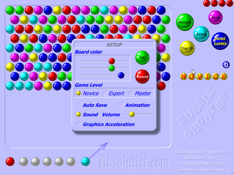 버블슈터는 버블 더미가 게임 하단까지 도착하게 되면 게임오버가 됩니다 해당 게임을 플레이 해보시고 자신의 점수가 어느 정도에 해당이 되는지 판단해 보시면 되겠습니다