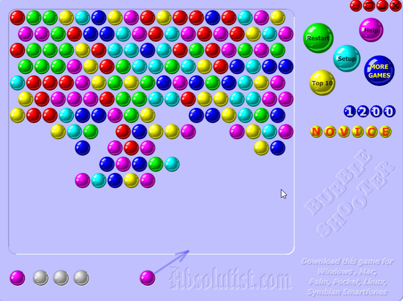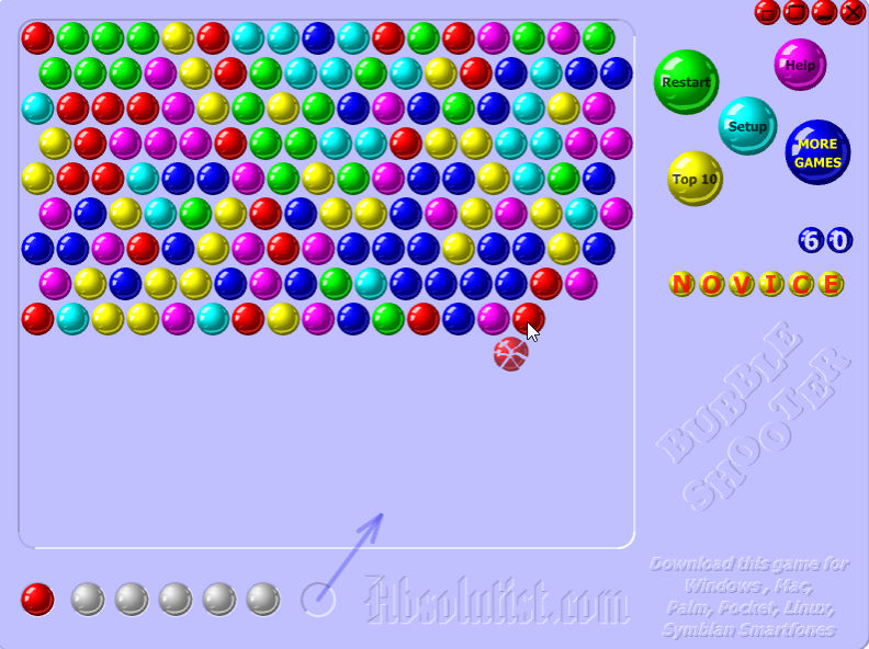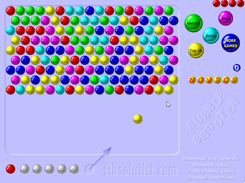 또한 왼쪽 하단에 있는 색깔 버블은 다음에 머가 나올지 보여주는 버블 색깔이라고 합니다 이제 모든 버블을 제거해서 점수를 얻거나 위쪽에 있는 버블들이 바닥에 닿을 때까지 플레이해 주시면 되겠습니다