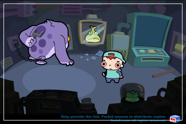 - 우측에 있는 쇠파이프를 얻은 뒤에 몬스터 뒤에 왼쪽 고리를 통해 구부려서 몬스터에게 줍니다 > 손잡이를 얻어서 오른쪽 변에 끼워서 작동을 합니다 > 오른쪽 하단에 있는 파이프를 얻어 좌측 상단에 끊어진 부분과 연결 > 하단 비커를 생물아래에 사용을 합니다 파란색 2번 노란색1번 빨간색1번 클릭 > 보라색 생물에게 줍니다 > 뒤에 보이는 철창을 클릭하면 > 탈출성공