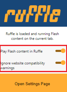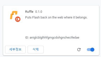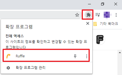 크롬 우측상단에 퍼즐모양을 클릭해주신 후 Ruffle를 클릭해주시면 됩니다
