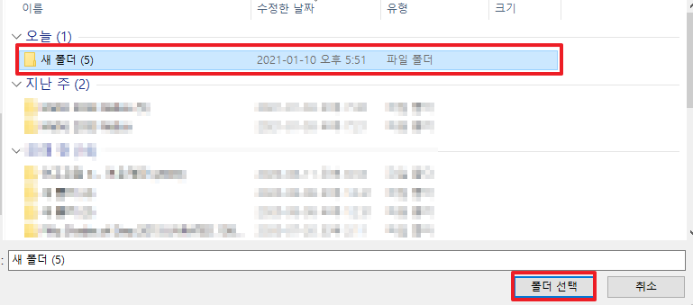 이렇게 창이 뜨는데 아까 압축파일을 넣었던 "새폴더" 를 클릭해주시고 "폴더선택" 을 눌러주시면 됩니다