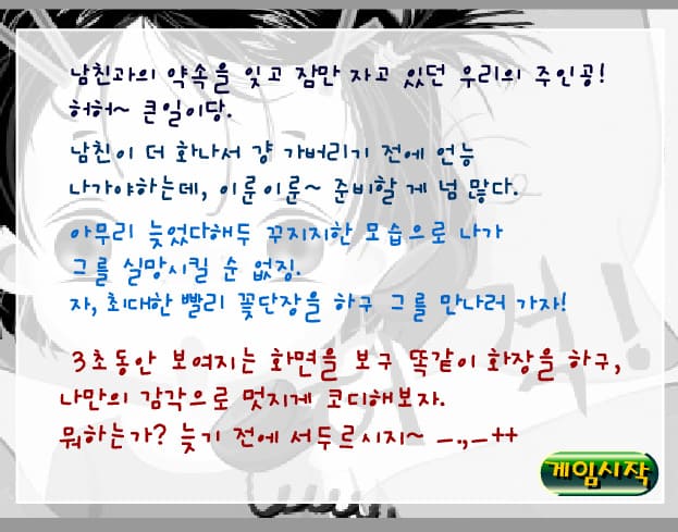 게임방법 : 남친과의 약속을 잊고 잠만 자고 있던 우리의 주인공 허허 큰일이당 남친이 더 화나서 걍 가버리기 전에 언능 나가야 하는데 이룬이룬 준비할 게 넘 많다 아무리 늦었다해두 꾸지지한 모습으로 나가 그를 실망시킬 순 없징 자 최대한 빨리 꽃단장을 하구 그를 만나러 가자 !