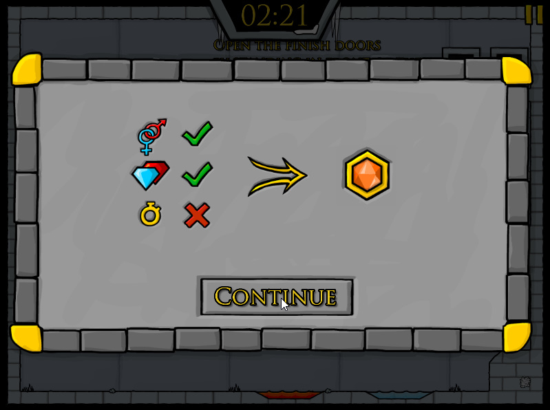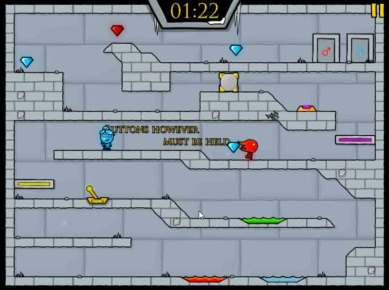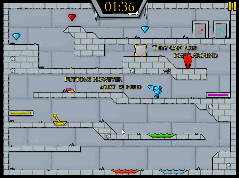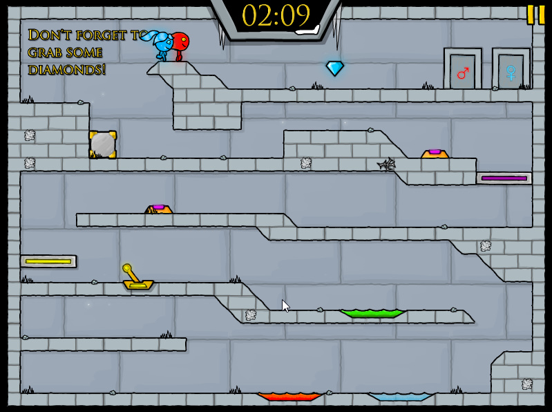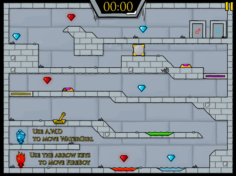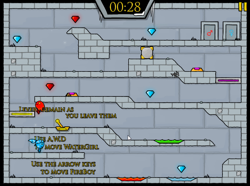 게임방법 : 파이어보이 앤 워터걸이 모험을 떠나는 내용의 게임입니다 물불게임의 후속작 게임으로써 두 주인공이 나와서 여러가지 장애물들을 협동플레이를 통해서 협동을 하여 레벨을 클리어하시면 되는 게임입니다