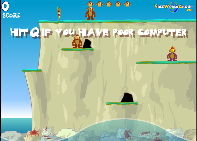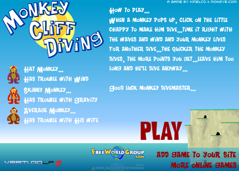 게임방법 : 원숭이 다이빙게임은 게임을 시작하게 되면 여러가지 원숭이들이 나옵니다 아래 하단을 보시면 파도들도 나오는데 파도가 최고점에 도달했을 때 원숭이들을 클릭하여 다이빙 시키시면 되는 게임입니다 기회는 총 5번이 주어지고 다이빙을 실수 하게되면 기회가 점점줄어들게 됩니다