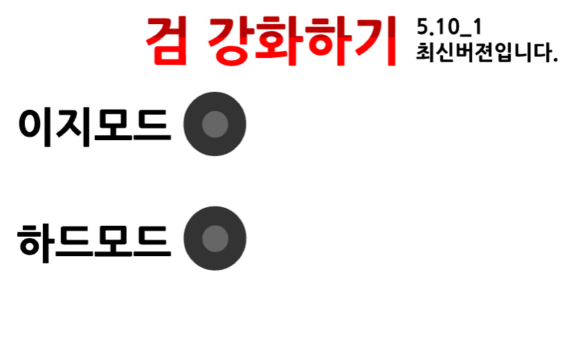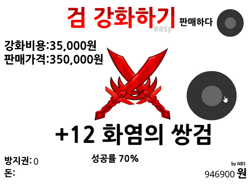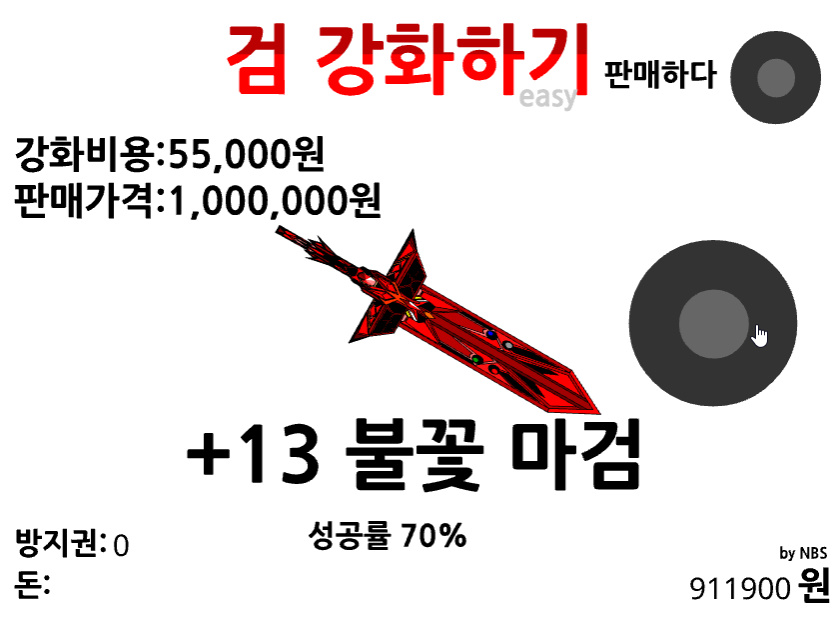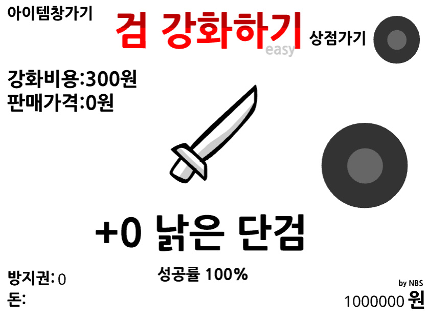 게임방법 : 검을 일정한 확률로 강화를 하시면 되는 게임입니다 강화를 성공하면 더 좋은 가격대로 팔 수 있습니다